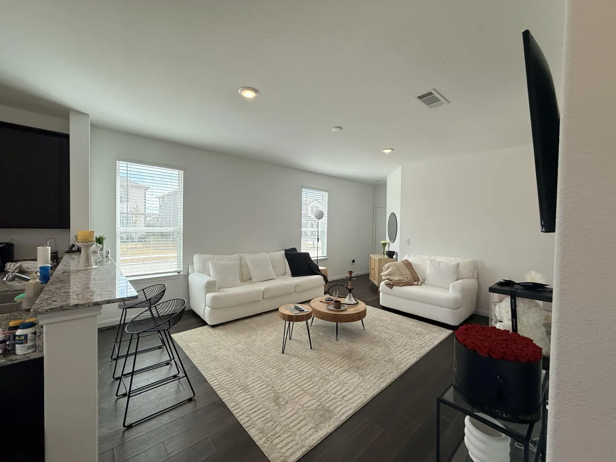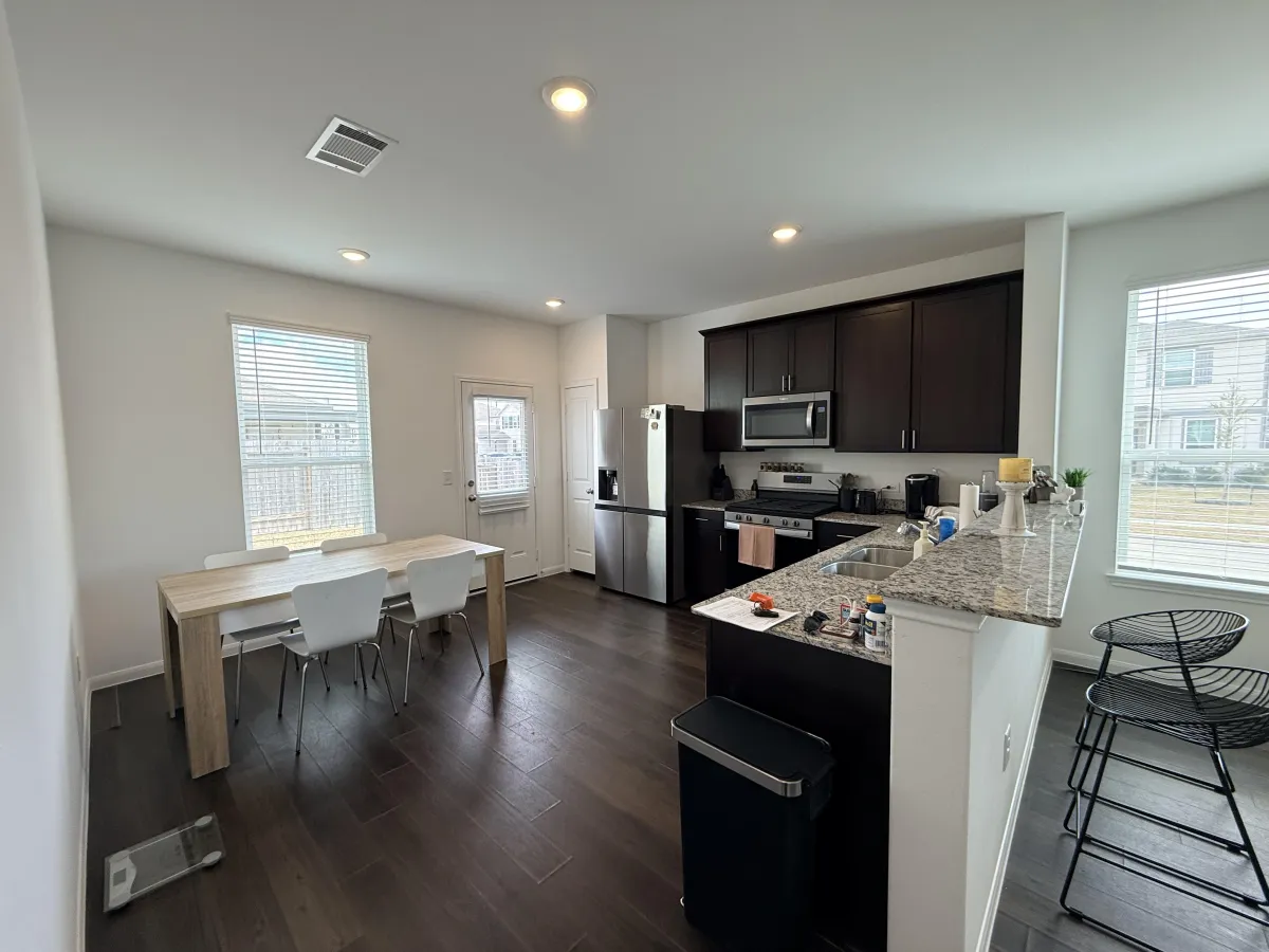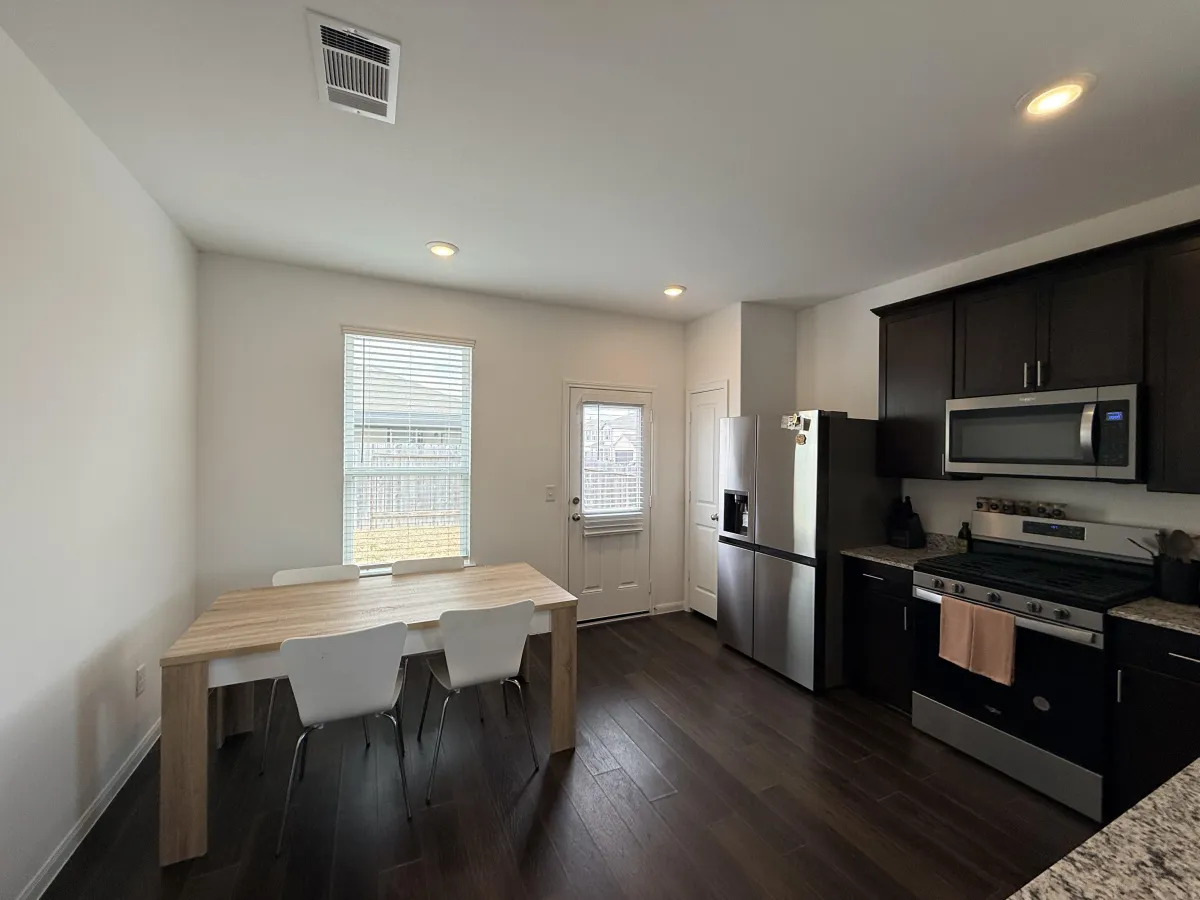 This home offers an outstanding layout with an open floor plan designed for comfortable everyday living and easy entertaining. The eat-in kitchen features upgraded 42-inch espresso cabinetry with satin nickel hardware, granite countertops, an undermount deep stainless-steel sink, and stainless-steel Whirlpool appliances. Luxury vinyl flooring runs throughout the main living areas, with carpet located only in the bedrooms and closets for added comfort. The fully fenced backyard sits on a desirable corner lot, providing added privacy and outdoor space.